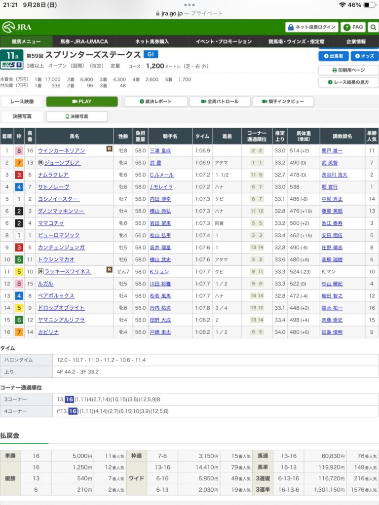 今日は残念な結果になってしまったがこれから秋競馬真っ盛り。G1レースも目白押しの競馬になるのでぜひ頑張って馬券を当てていきたいと思います。