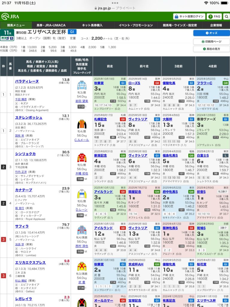 競馬15 Nov 2025第50回エリザベス女王杯(G1)の見解約1分Tweet0Share on Tumblr 内枠からステレンボッシュ、エリカエクスプレス、レガレイラ、ココナッツブラウン、リンクステップ。 第50回エリザベス女王杯(G1)を振り返って 申し訳ございません。外れました。2着馬のパラディレーヌ、3着馬のライラックを買っていませんでした。マイルチャンピオンシップは当たるように頑張ります。