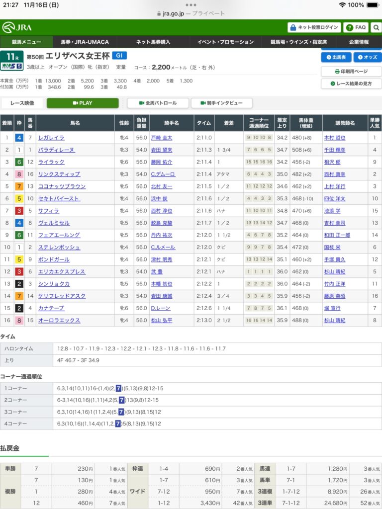 競馬16 Nov 2025第50回エリザベス女王杯(G1)を振り返って約1分Tweet0Share on Tumblr 申し訳ございません。外れました。2着馬のパラディレーヌ、3着馬のライラックを買っていませんでした。マイルチャンピオンシップは当たるように頑張ります。 第50回エリザベス女王杯(G1)の見解 内枠からステレンボッシュ、エリカエクスプレス、レガレイラ、ココナッツブラウン、リンクステップ。
