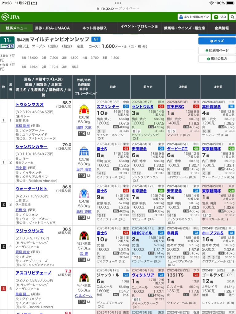 競馬22 Nov 2025第42回マイルチャンピオンシップ(G1)の見解約1分Tweet0Share on Tumblr ジャンタルマンタル、ソウルラッシュ、ガイアホース、オフトレイル、マジックサンズ。 第42回マイルチャンピオンシップ(G1)を振り返って 勝ったジャンタルマンタルは軸として固いと思いこの馬を中心に馬券を買った。馬連と馬単はゲットできたが3着に突っ込んできたウォーターリヒトは全くのノーマーク。4着に来たオフトレイルは昨日の推薦馬で紹介していたので3連複で買っていたが後の祭り。 馬連と馬単は的中したけど3連複を逃したショックの方が遥かに大きい。来週にはジャパンカップがあるが今年は外国馬も参戦しているので馬券は難解となりそうだ。でも気を取り直して頑張っていきたい。