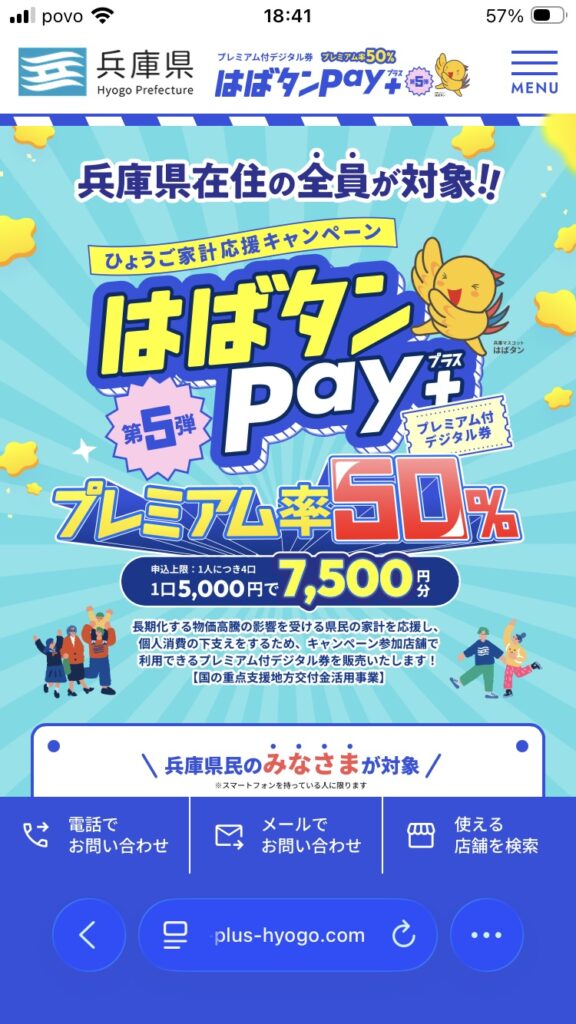 私たちの兵庫県民限定なんだけど、「はばタンPay」というプレミアム付デジタル券が昨日3付き18日から受付がはじまったので先程申し込んだ。プレミアム付デジタル券とはどういうものかというと、要は先にお金を払うと50%のプレミアムがつくという有難いもの。5、000円だと7,500円分使えるという私にとっても皆さんにとっても大変有難いものを私たちの兵庫県がやってくれたのだ。